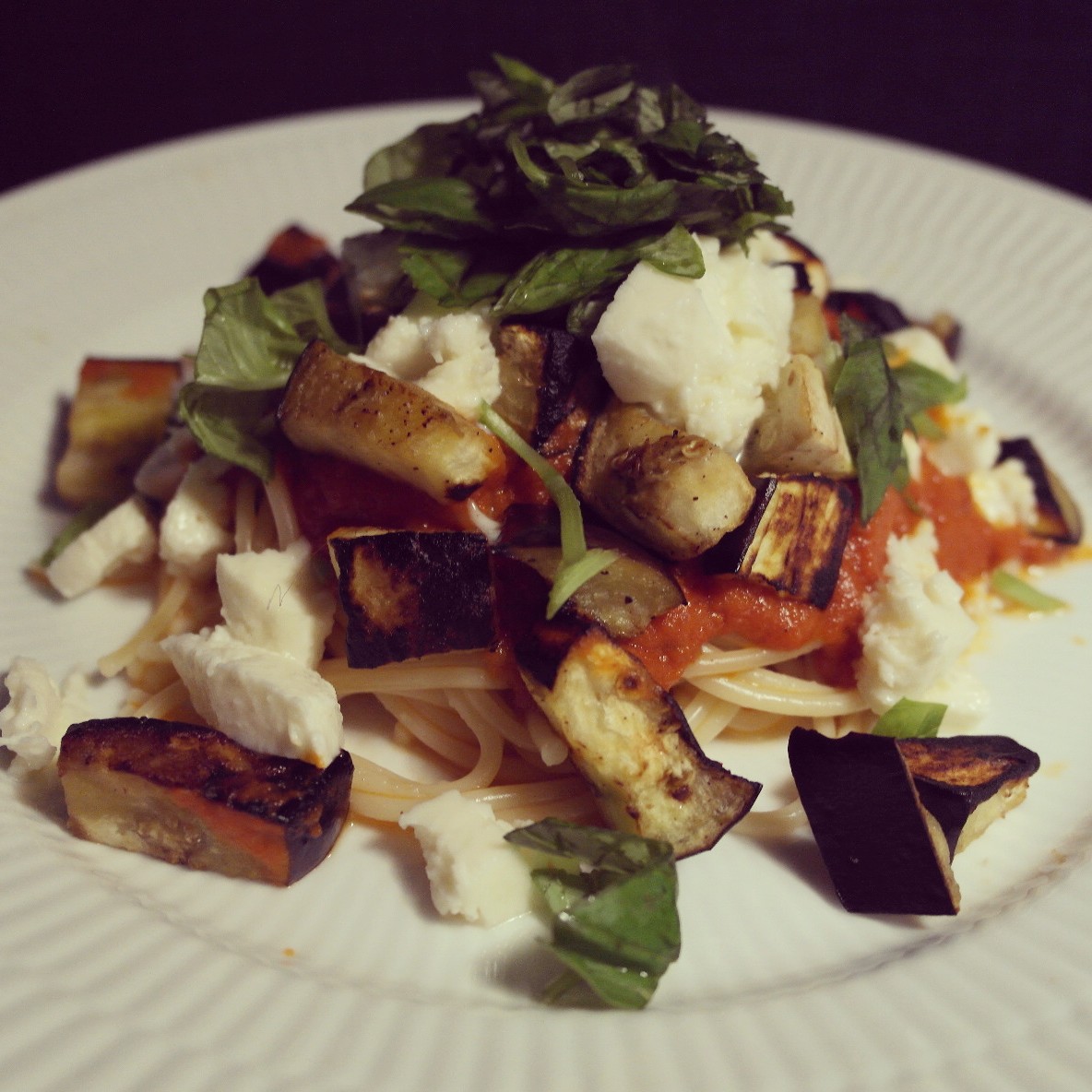 En lækker forret eller hovedret kan f.eks. være denne ret. Stegt aubergine på panden, verdens bedste tomatsauce (opskrift følger) spaghetti, toppet med friskhakket basilikum og mozzarella…mmmm haps. Savner du kød, så steg din favorit såsom kylling, en saftig bøf eller fisk. Skær det i strimler og top retten med det. Et styks fyldigt og lækkert måltid.